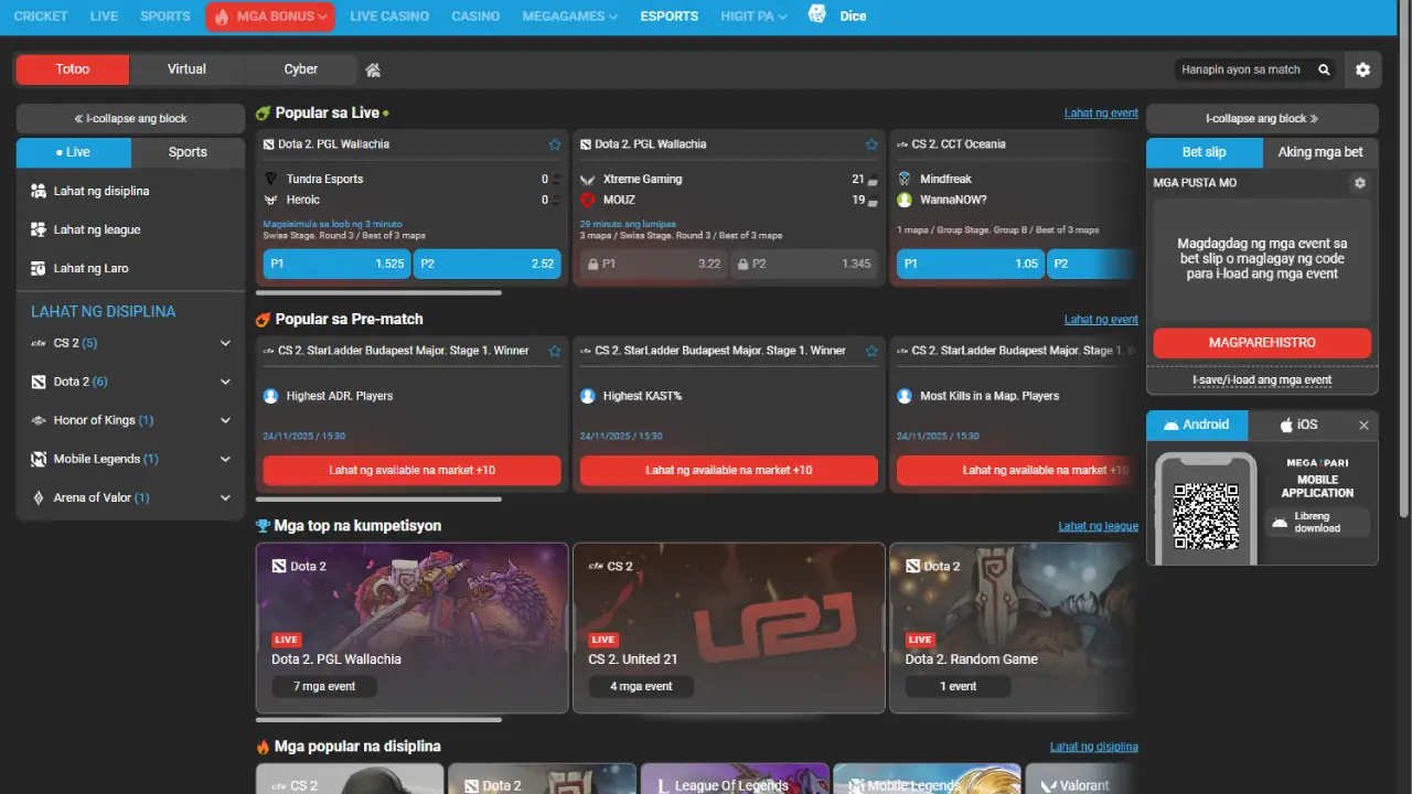 Esports disciplines are a separate betting category on our MegaPari website. Within this category, various esports teams compete against each other in games such as Dota 2, LOL, CS 2, and others. They offer players unique types of outcomes and an experience unlike betting on traditional sports.