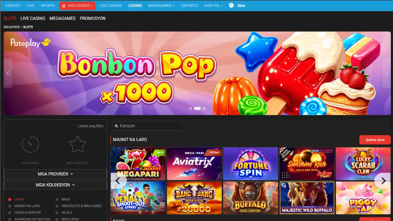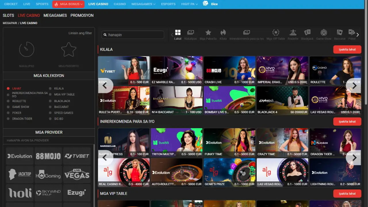 Play over 4,000 casino games on the MegaPari website. Here you will find everything from classic slots to live shows with live dealers. Choose games with different RTP or volatility rates. We offer games from top providers such as Pragmatic Play, Evolution Gaming, NoLimit City, Red Tiger, and others. Find more information about the types of MegaPari games below.